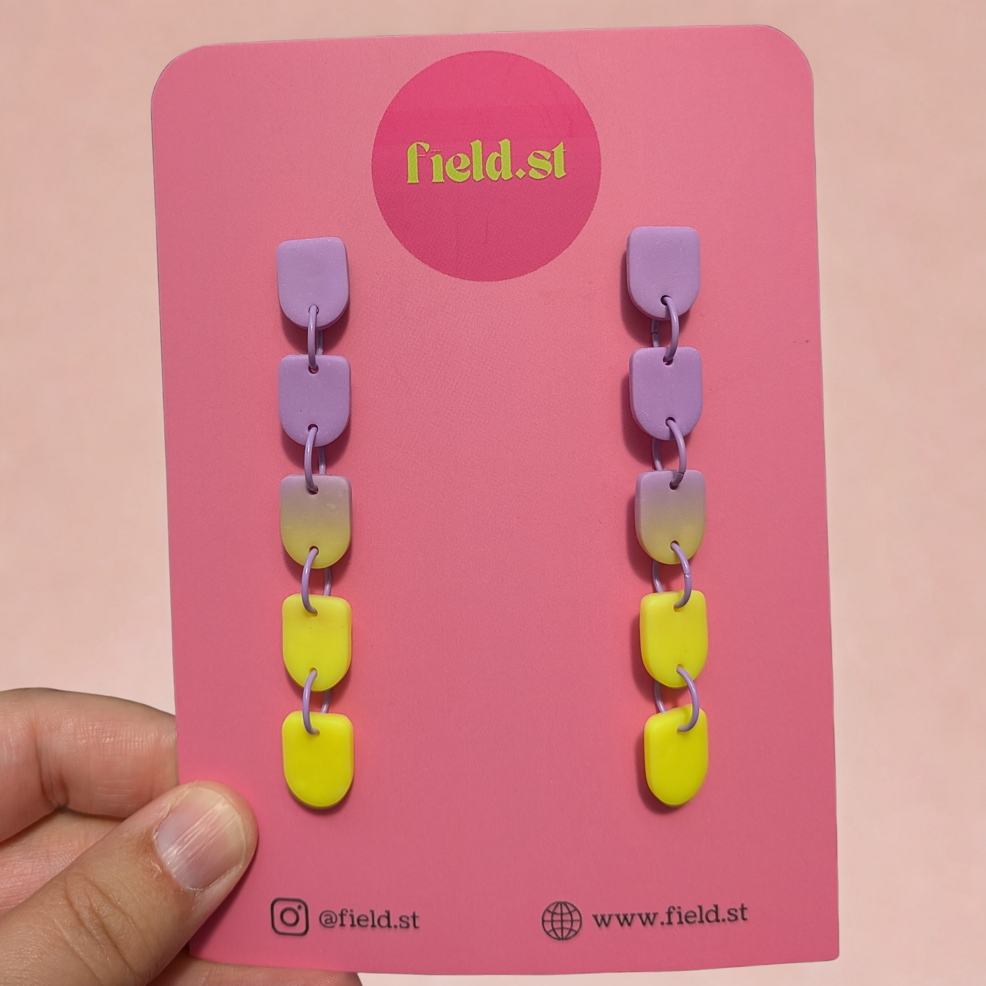 Bright, playful, and full of movement – these long dangle earrings are a burst of colour for any outfit. Each pair features a vivid mix of zingy neon yellow and soft lilac, linked together in a cascading chain of sculpted polymer clay shapes.